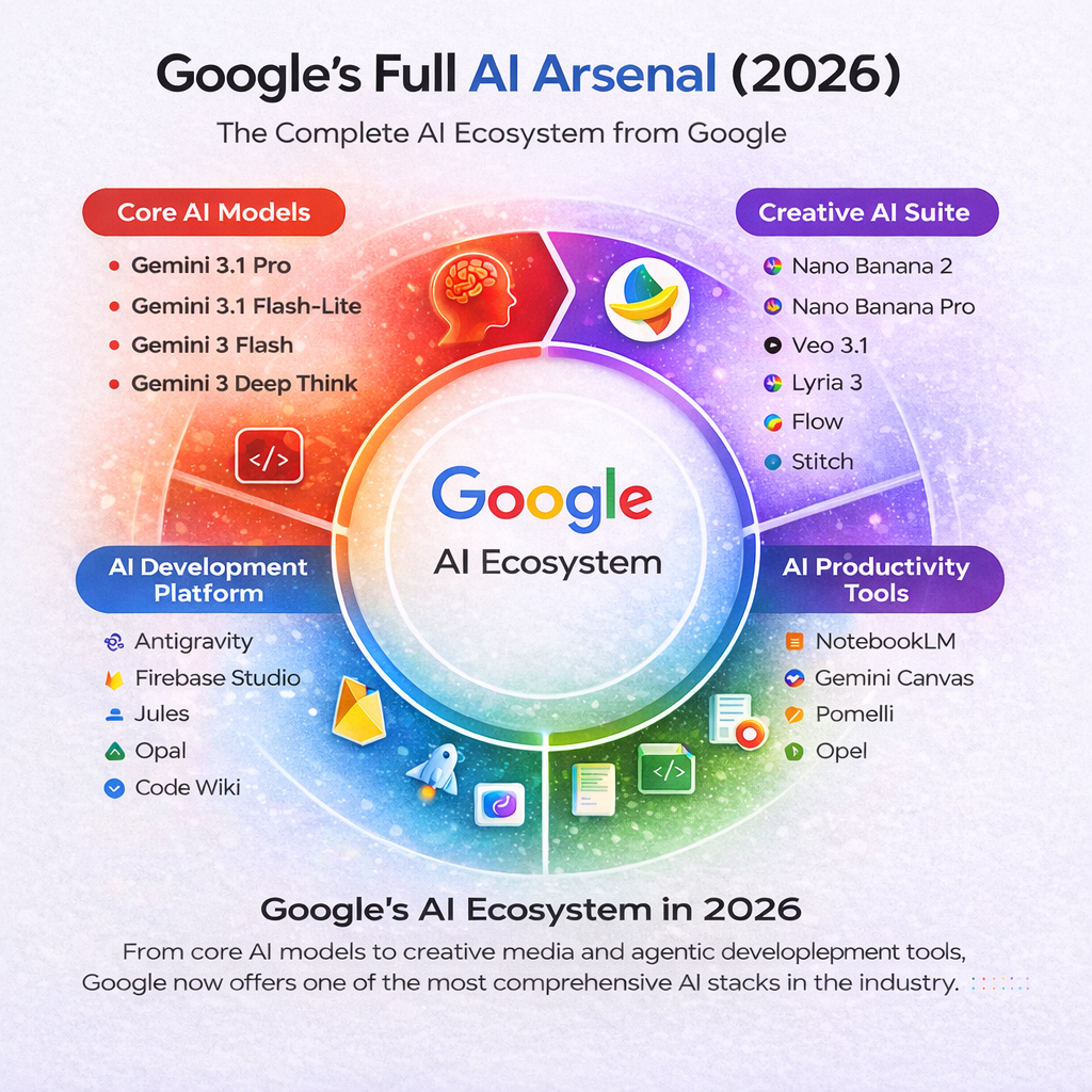 Google has gone all-in on AI in 2026. From foundational language models to creative media suites and agentic development platforms, the company has quietly assembled the most comprehensive AI ecosystem of any tech giant. Here is every tool you need to know about what it does, who it is for, and how to access it.